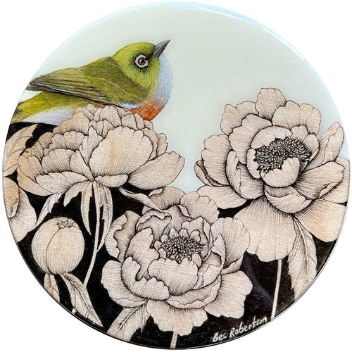 Bec’s most recent works are intricately beautiful depictions of native New Zealand birds and flora. She explores ink, watercolour and paint in her mixed media pieces. These mediums are immortalised through a glorious seal of resin, allowing a vibrant contrast with the fine line ink, wooden base texture, and paint colour palette. We think this technique creates simply stunning results.