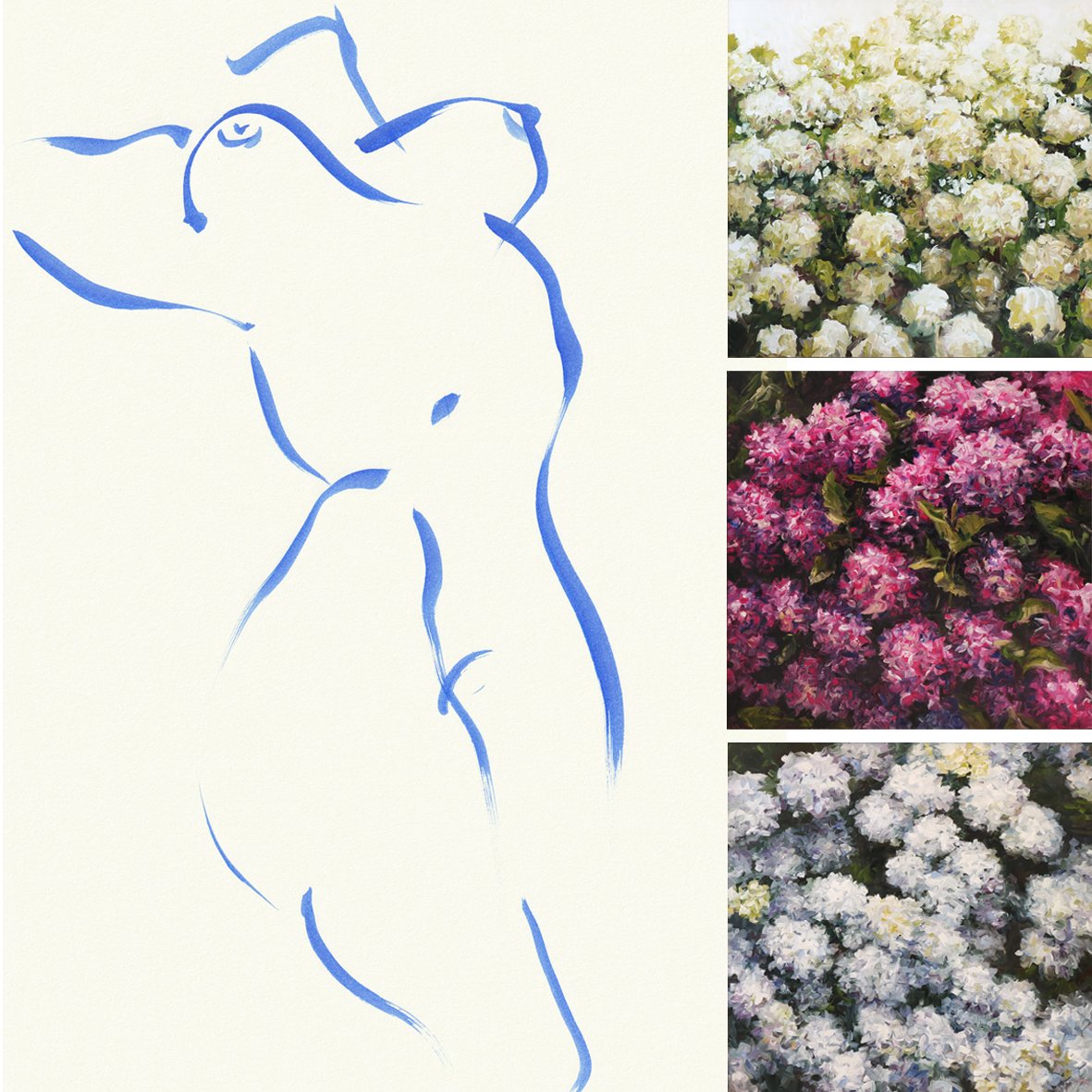 "Bodies in Bloom” a simply gorgeous joint exhibition of all new original works by Dominique Marriott and Dean Wallace. Dominique’s work is a wonderful collection of her trademark confident, simple lines that embody the energy & grace of each pose she has captured in her life drawing sessions. This collection brings you new works in the this divine blue ink, along with her much loved black sumi ink pieces. Each work is beautifully float framed in natural wood. Dean Wallace is showing a collection of all new oil paintings. Capturing the drama, texture and colour of the much loved hydrangea, Dean will be exhibiting a divine body of work that also includes his sought after still life works. Many of you have been after Dean's larger works and you will not be disappointed.