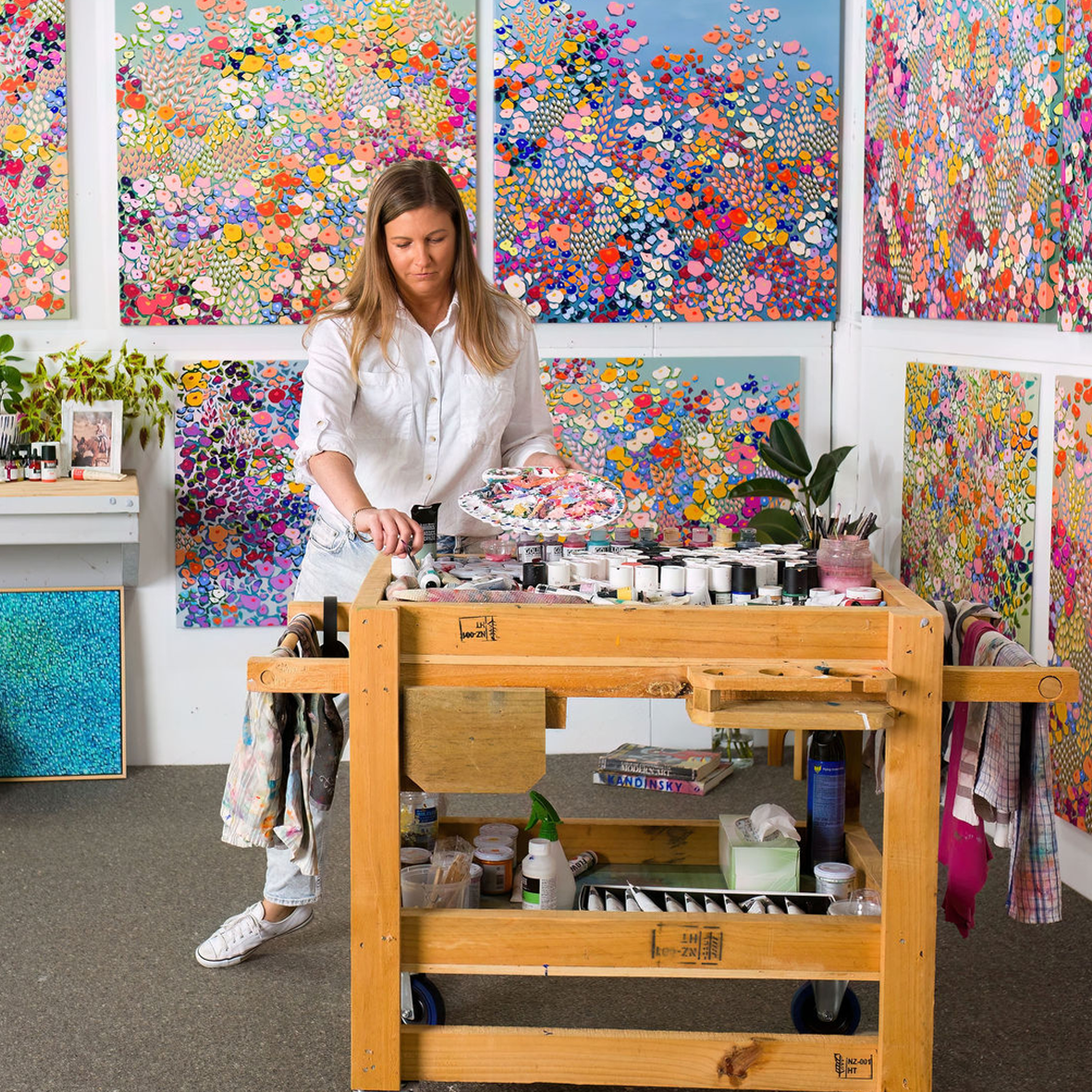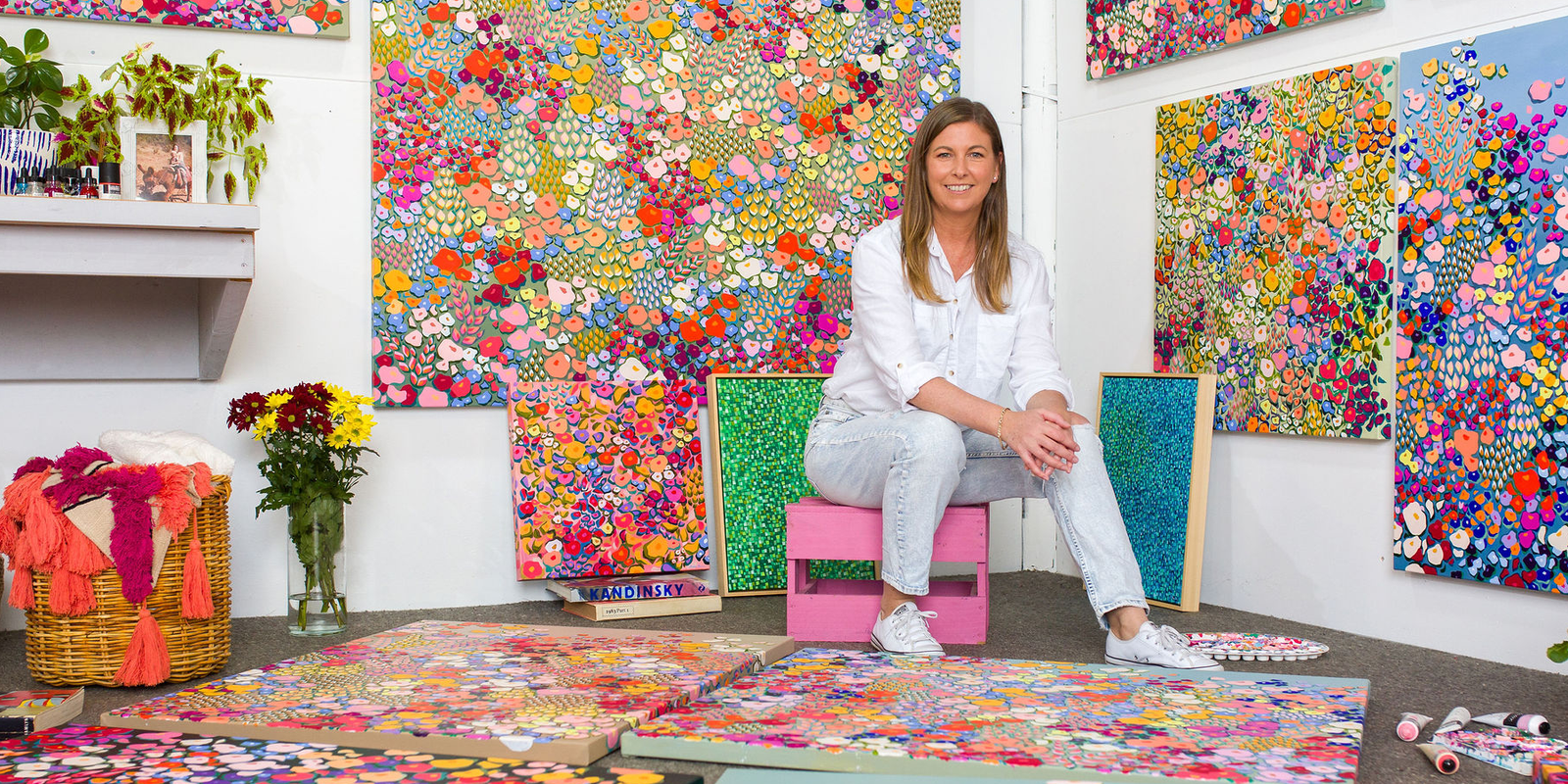 Using Floral motifs and organic forms in vibrant colour palettes, each painting is an arrangement of tessellating and intriguing shapes and patterns. The rhythmic cadence of each composition intends to convey the vivaciousness, vitality and movement that saturate the tapestry of the natural world. In this liminal space, nature is woven into the fabric of creative expression.