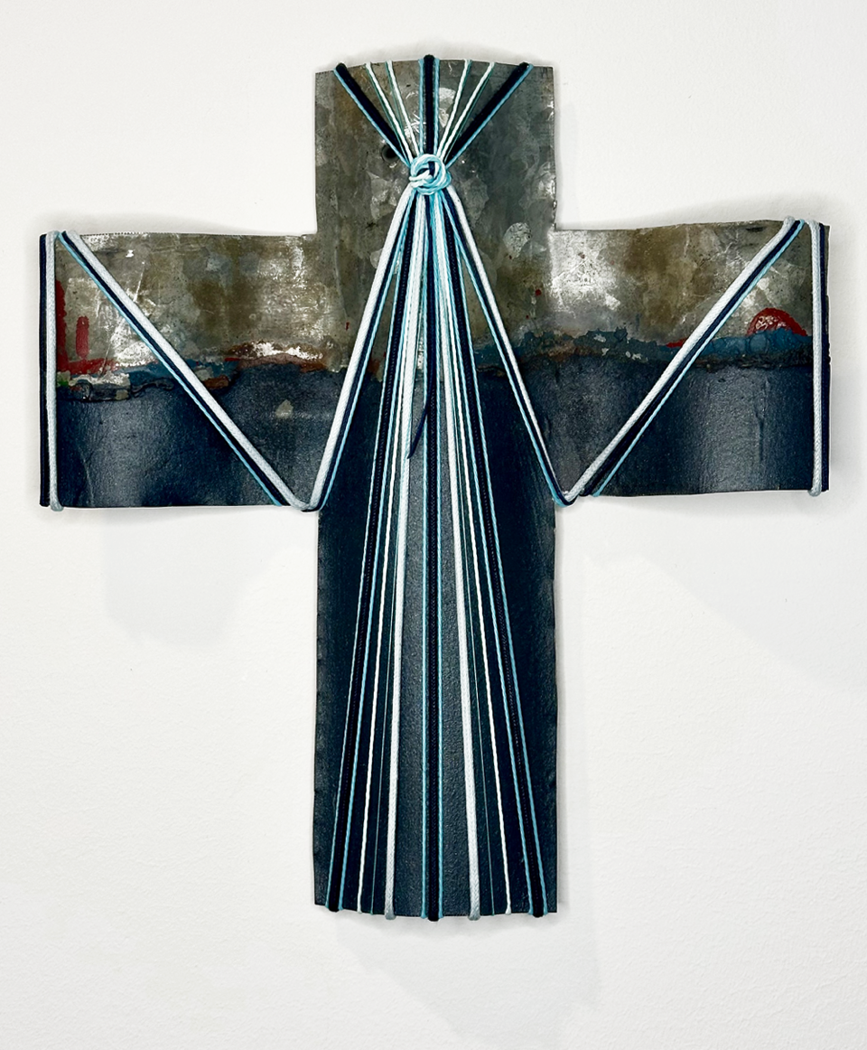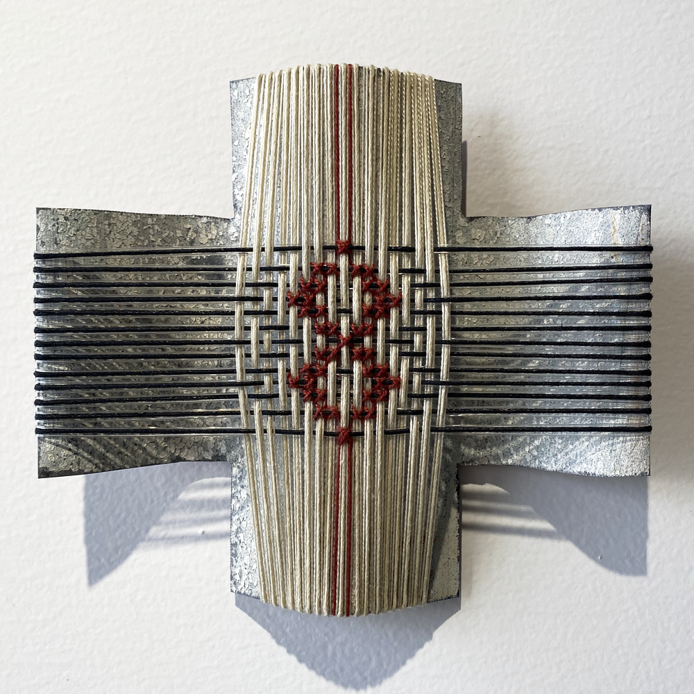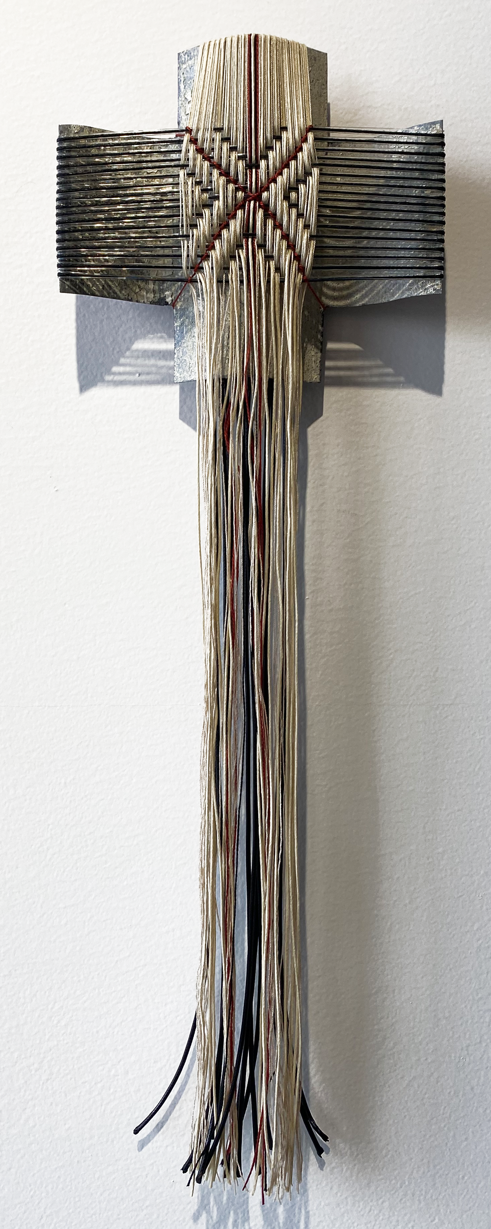 Hers is a work of constant evolvement—most recently, she has been weaving threads instead of words to portray the interlinked nature of family, culture, and heritage. We are thrilled to show these rustic ‘Corrugated Histories’ crosses, which look gorgeous hung alone, as a group, or alongside other artworks.