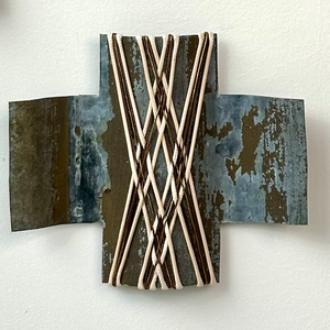 Rescued corrugated iron from Wānaka, woven with waxed cord and found picture framing wire